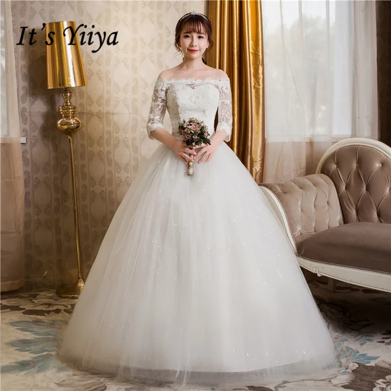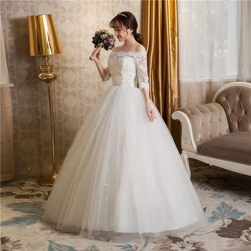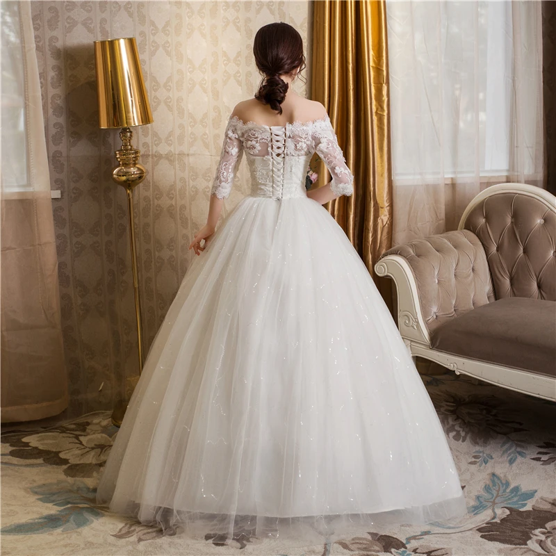 Free Shipping 2017 Plus size Boat neck White Lace Sleevs wedding Dresses Princess Bride Gowns Frock